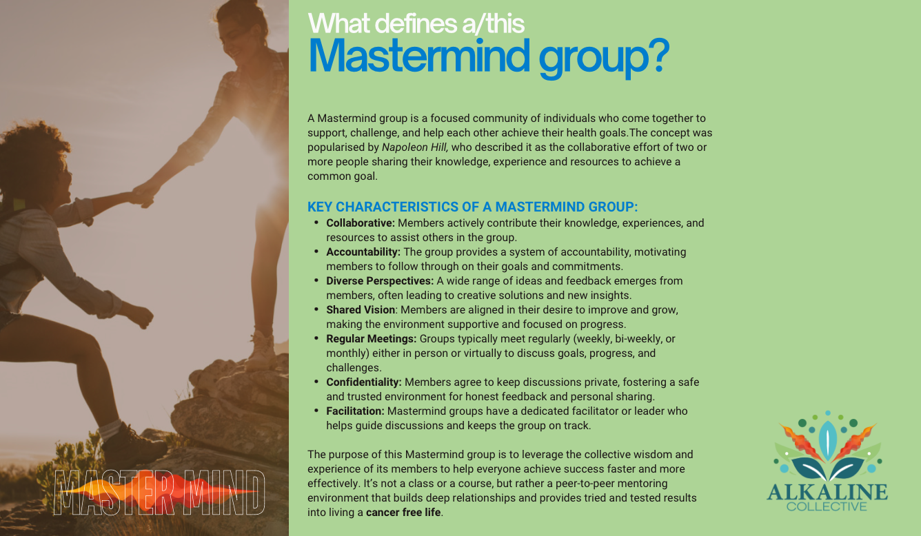 Welcome to the Alkaline Collective Mastermind — a community for anyone facing cancer, staying cancer-free, or committed to prevention. No matter your stage, whether you’ve chosen conventional care, an integrative path, or a fully holistic approach!